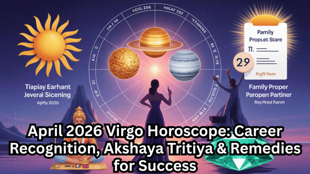April 2026 for Virgo Ascendant is a month of career recognition, partnership opportunities, and spouse support. The exchange between 10th and 7th lords creates a powerful Raja Yoga. Financially, you will see strong gains on April 18â19. Be cautious of being fooled on April 13â15 and guard your health on April 26â27. Use the auspicious Akshaya Tritiya for new beginnings. Strengthen relationships with siblings and enjoy quality time with children.